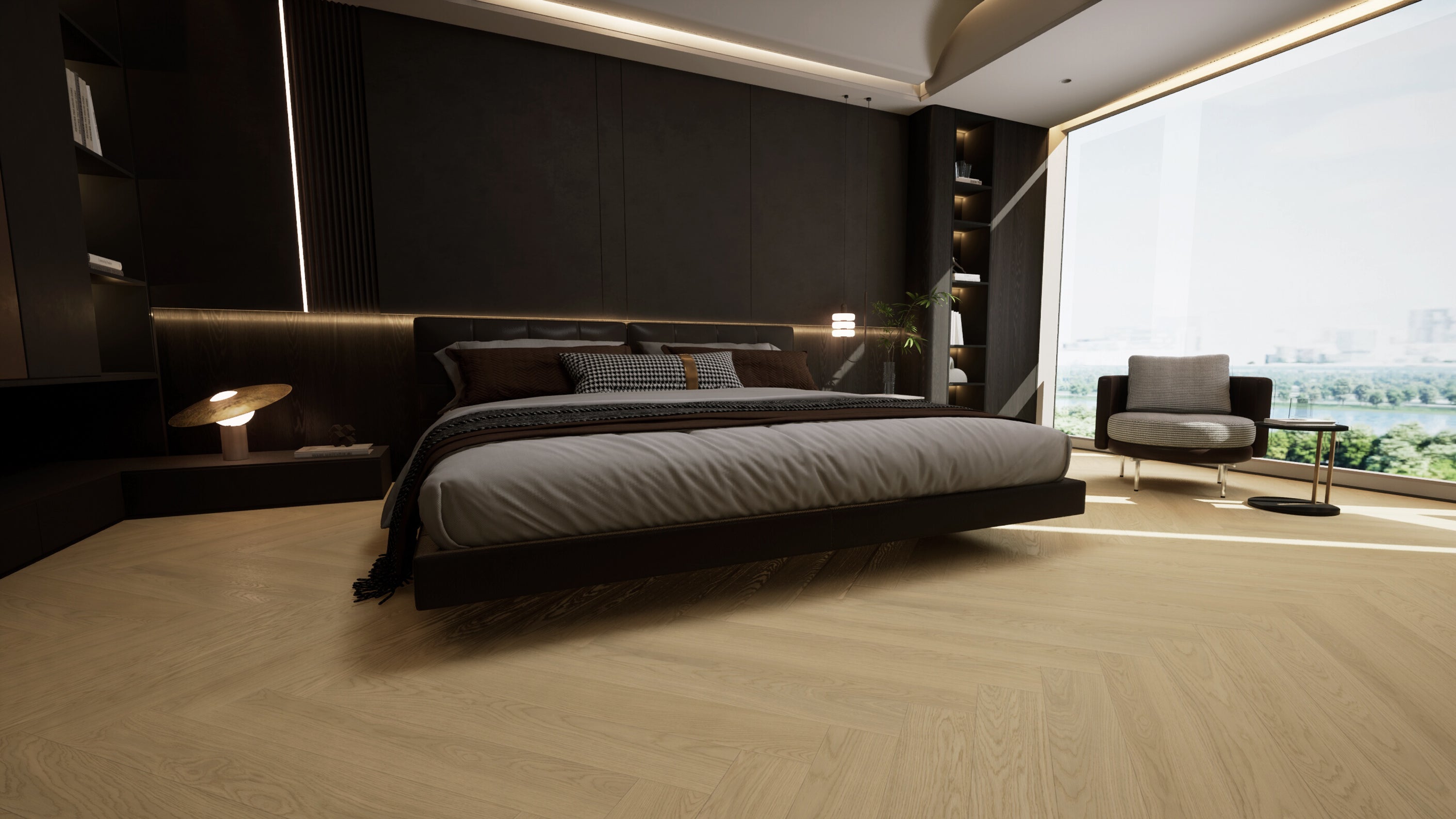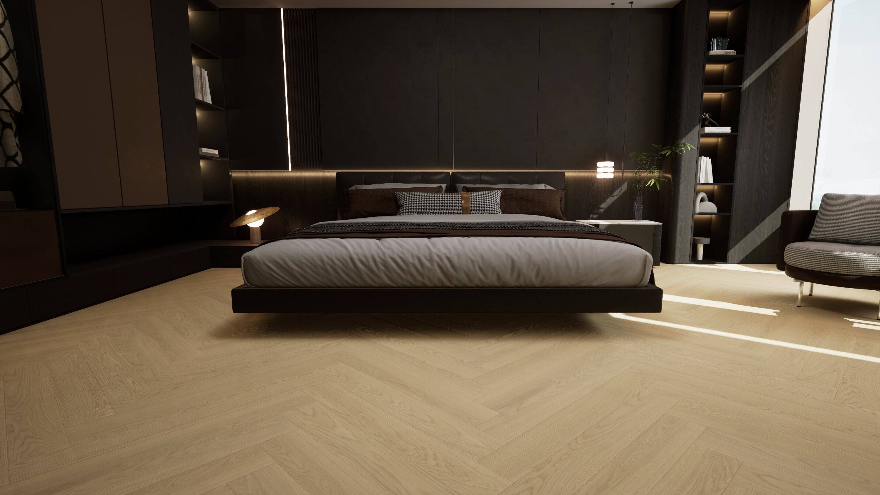 Abbotsford Herringbone is an engineered European white oak floor in a soft cream herringbone pattern with a durable UV lacquer finish for a refined, airy look.