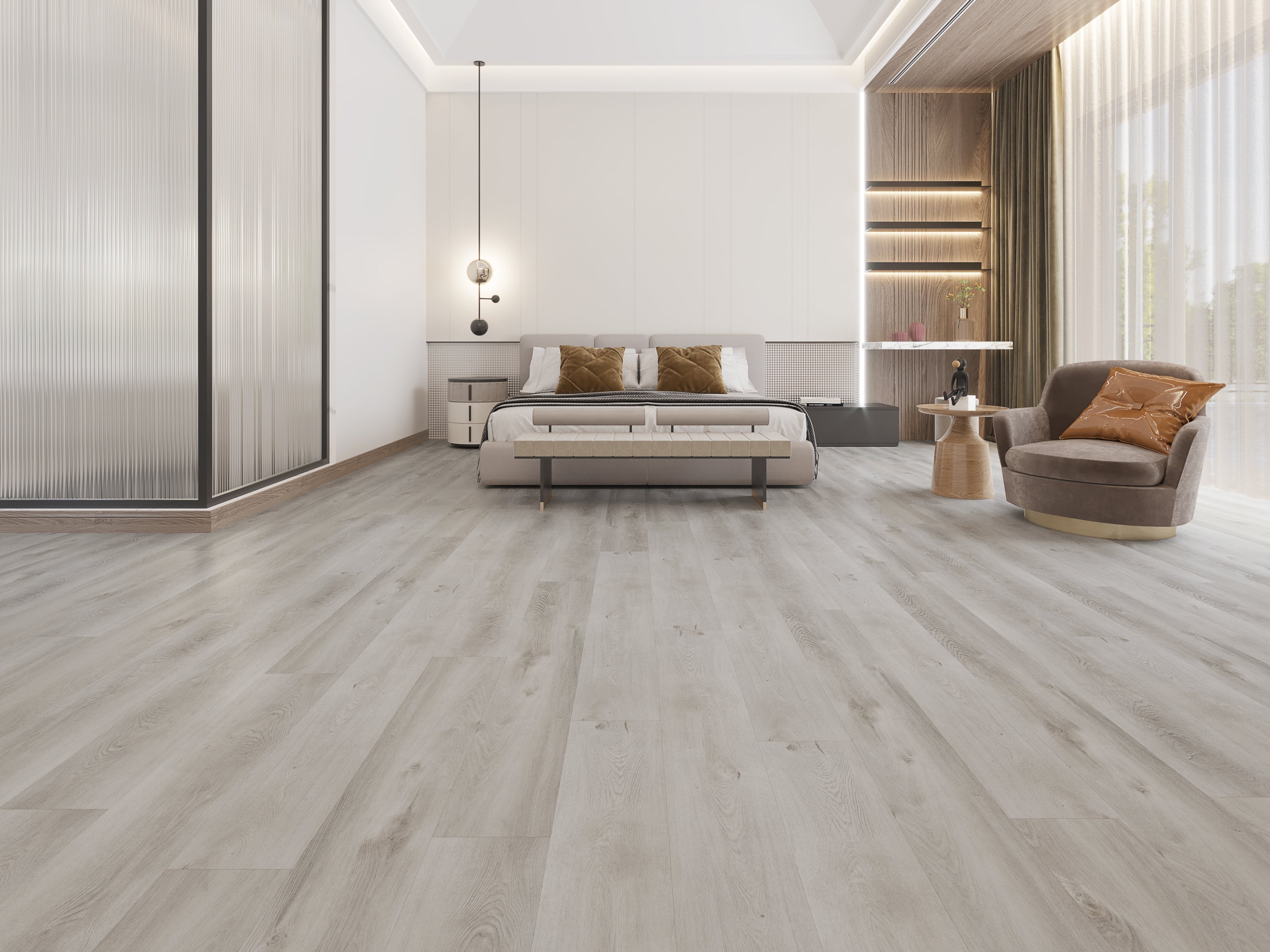 Tannin is a sleek grey, 100% waterproof SPC vinyl plank from the Thomas House Matte collection featuring a super-matte ceramic UV finish and realistic wood texture.