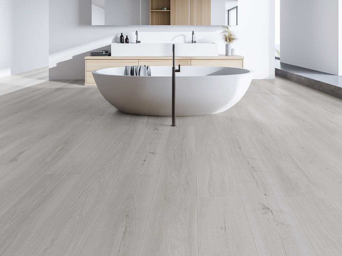 Hyde is a gray oak laminate from the Pacific Vineyard Collection featuring an embossed-in-register texture and a charcoal-infused waterproof core for durable, coastal-inspired style.
